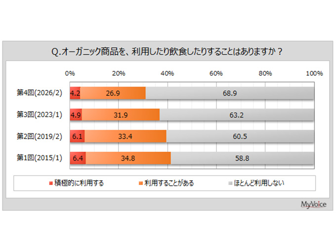 オーガニック商品の利用者は3割強、過去調査と比べて減少傾向 / マイボイスコム調べ