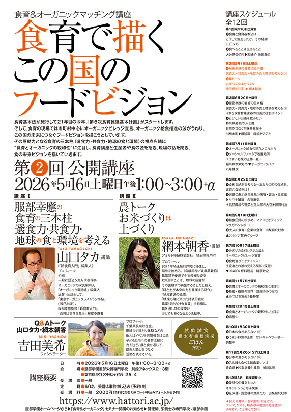 2026年4月より毎月1回、服部栄養専門学校にて「食育&オーガニック」セミナーを開講します。