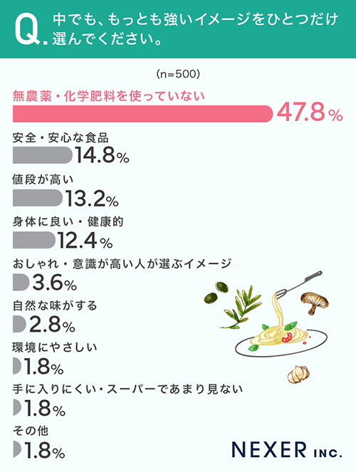 中でも、もっとも強いイメージをひとつだけ選んでもらいました。こちらも、もっとも多い回答は「無農薬・化学肥料を使っていない」の47.8%でした。次に「安全・安心な食品」が14.8%、「値段が高い」が13.2%と続いています。