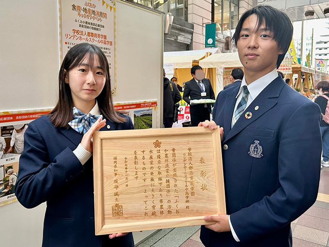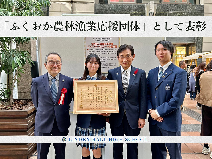 リンデンホールスクール中高学部は、2025年11月1日に開催された「食育・地産地消月間キックオフイベント」において、オーガニック給食の取り組みが県産農林水産物の消費拡大に繋がる活動と高く評価され、「ふくおか農林漁業応援団体」として表彰を受けました。