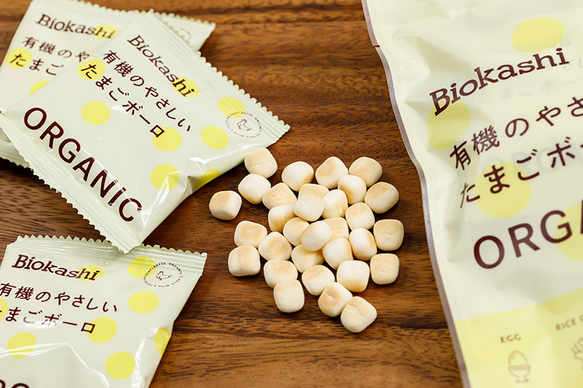 「Biokashi 有機のやさしいたまごボーロ」は、有機野菜のリアルな生産現場やその実情と向き合い、行き場を失った有機じゃがいもからとれる有機でんぷんを活用したお菓子です。北海道産有機馬鈴薯でんぷん、平飼いで育てられた鶏から産まれる有機卵、従来のたまごボーロの材料としては珍しい有機米飴などを使用しています。