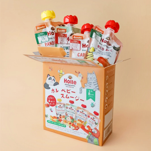 世界で最初にデメター加工・加工品認証を取得したベビーフードメーカーHolle(ホレ)社。月齢に応じて、果物や野菜を組み合わせたベビースムージーは、オーガニック原材料100%、全商品でデメター認証を取得。シンプルな原材料で余計なものを一切加えず、果物や野菜のおいしさを存分に引き出した、手軽に美味しく栄養がとれるベビースムージーです。春の旅行やお出かけにも大活躍!