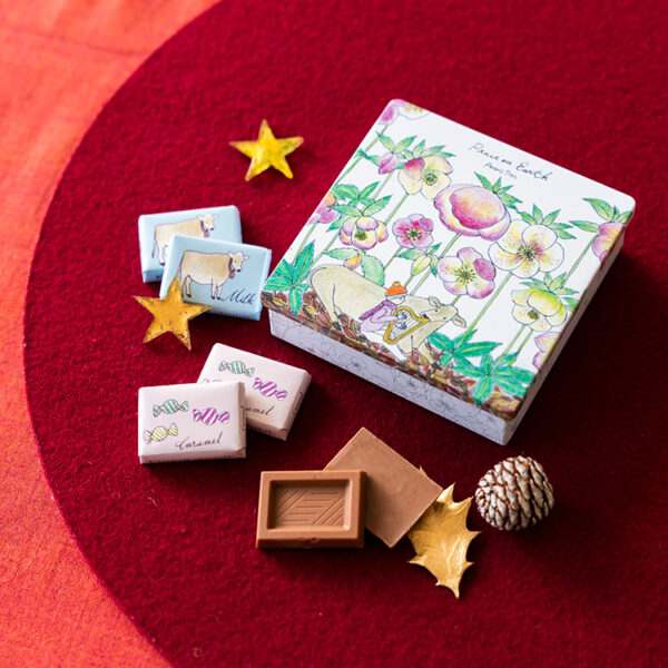粗糖を使ったミルクチョコと、カリカリのカラメル入りミルクチョコをひとくちサイズでセット。クリスマスやバレンタインのギフトや、自分へのご褒美にぴったりのイラスト缶に紙製の内袋、その中にイラストつき個包装のチョコ。「Peace on Earth」のメッセージは、人も木も地球に生きるすべての幸せを願って。
