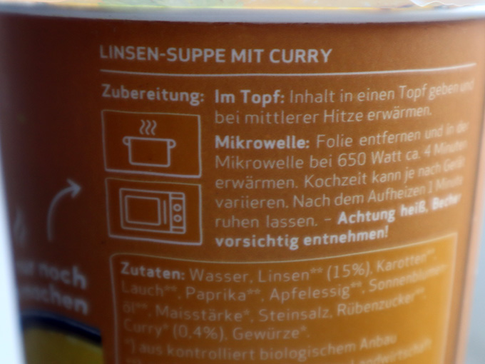 Zutaten: Wasser, Linsen* (15%), Karotten*, Lauch*,Paprika*, Apfelessig*, Sonnenblumenöl*, Maisstärke*, Steinsalz, Rübenzucker*, Curry* (0,4%), Gewürze*.*) aus kontrolliert biologischem Anbau